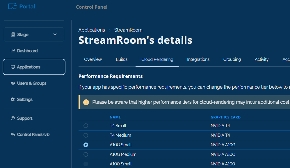 Once inside the specific application settings, you have to reach the Cloud Rendering tab. Here you should the Performance Requirements options.